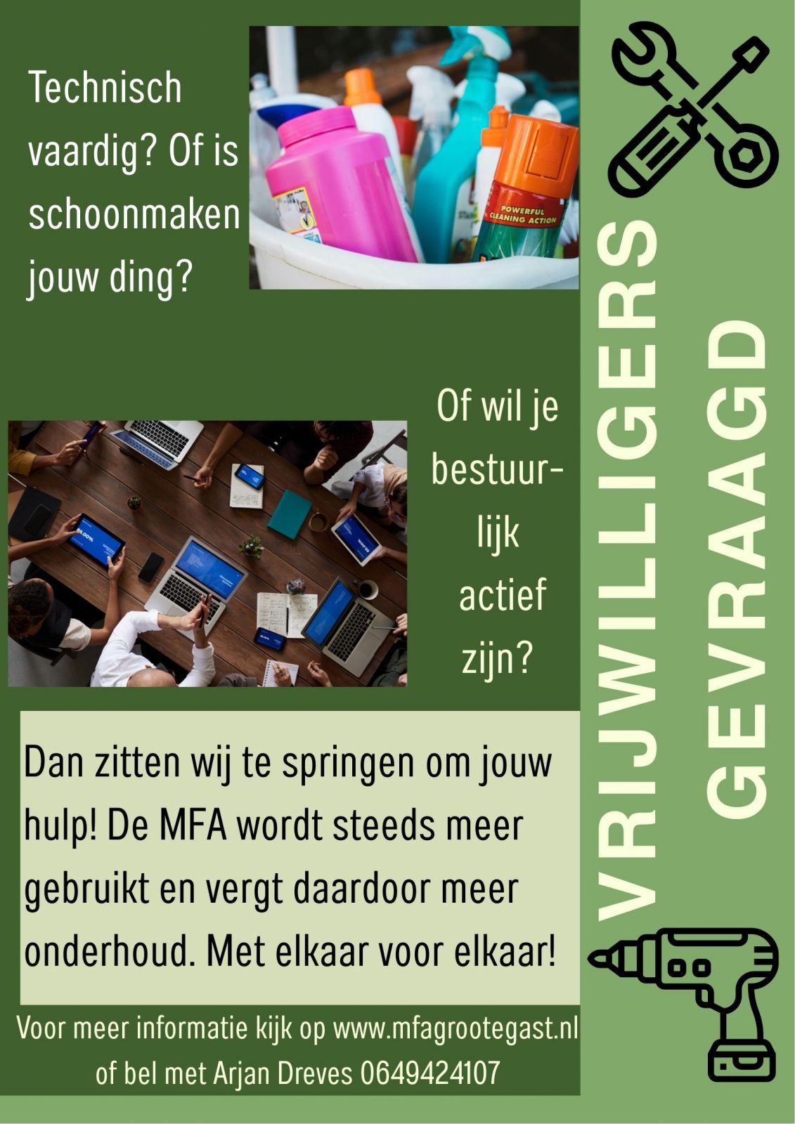 Het bestuur van Stichting MFA Grootegast is verantwoordelijk voor het onderhoud, de verhuur en het gebruik van het gebouw in de ruime zin des woords. Zoals bij veel vrijwilligers organisaties zijn ook wij op zoek naar extra handjes.